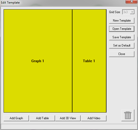 The Analysis template Editor allows you to design your own templates for analysis. Currently there are 4 different components that can be part of an analysis report. Graph, a Table, a Video or a Dynamic 3D view. Select the grid size, then add any of the components. A components can span over more than one "cell" by dragging the corner over to adjacent cell.